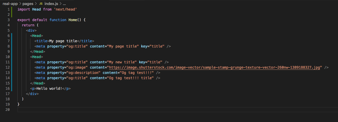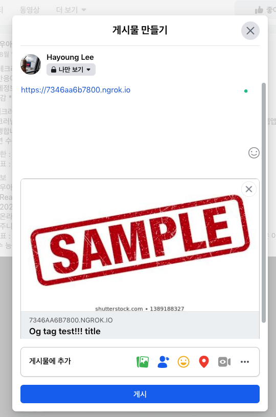 import Head from 'next/head' export default function Home() { return ( <div> <Head> <title>My page title</title> <meta property="og:title" content="My page title" key="title" /> </Head> <Head> <meta property="og:title" content="My new title" key="title" /> <meta property="og:image" content="https://image.shutterstock.com/image-vector/sample-stamp-grunge-texture-vector-260nw-1389188327.jpg" /> <meta property="og:description" content="Og tag test!!!" /> <meta property="og:title" content="Og tag test!!! title" /> </Head> <p>Hello world!</p> </div> ) }ngrok를 통해서 내 로컬 서버를 한번 올려보겠다!! ngrok는 ngrok.com/