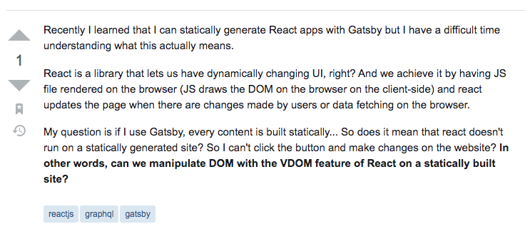요약하자면, Gatsby로 정적 생성을 한다는데, 이말이 즉슨, React가 vdom을 이용해서 효율적으로 dom 변화를 해주는 것을 이제 못한다는 말이냐? 였다. 내 짧은 지식으로 html을 다 생성한다면서 이게 대체 뭔소리냐.... 싶었던 것이다.