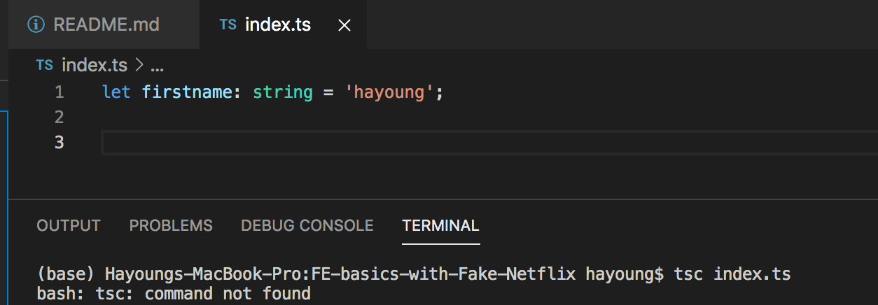 하지만 tsc index.ts 를 통해서 컴파일하려고 하면 되지 않는다. 당연하다. 왜냐하면 컴파일러가 없으니까!! 이건 설치를 해줘야한다.