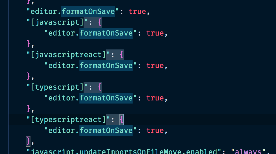 "editor.formatOnSave": true, "[javascript]": { "editor.formatOnSave": true, }, "[javascriptreact]": { "editor.formatOnSave": true, }, "[typescript]": { "editor.formatOnSave": true, }, "[typescriptreact]": { "editor.formatOnSave": true, },
