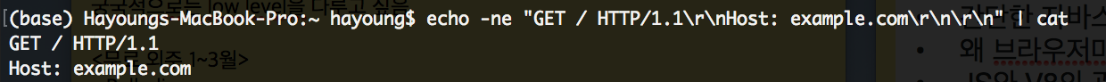 echo -ne "GET / HTTP/1.1\r\nHost: example.com\r\n\r\n"| nc example.com 80echo: 화면에 문자열을 출력한다(더보기)