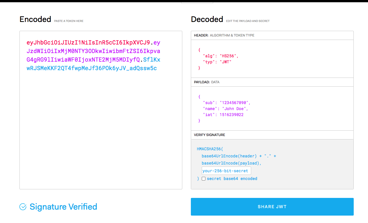 { "sub": "1234567890", "name": "John Doe", "admin": true }