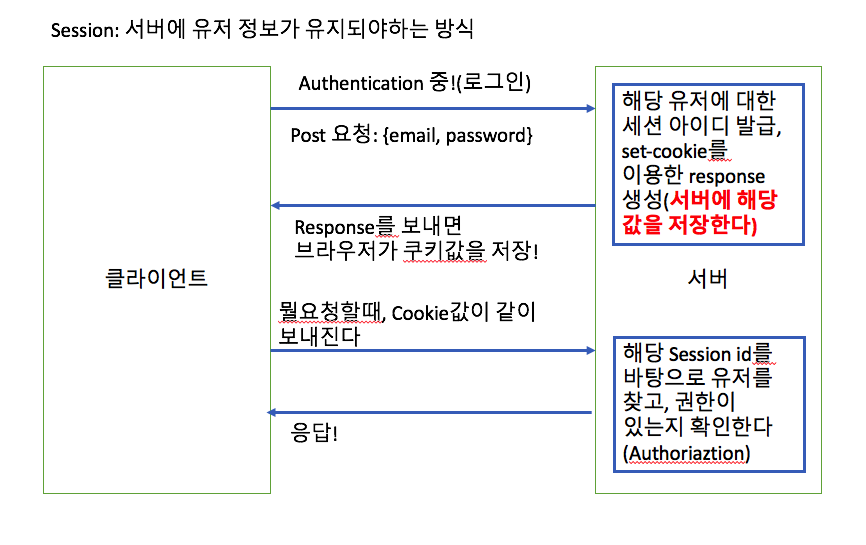 로그인할때(Authentication할때), response에 set-cookie헤더를 사용해서 Session id를 보내놓고, User가 요청할때, 무조건 session id쿠키를 같이 보내서, 이 쿠키값이 서버의 메모리든 뭐든에 저장되어있던 session 값과 일치하는지 확인하고, 이 user가 리소스에 접근을 해도 되는지 파악한다(Authoriaztion)