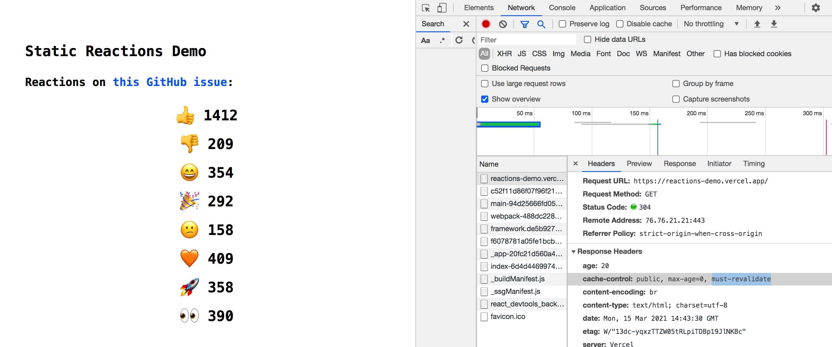 이건 next.js의 데모 사이트인데 여기를 보면 페이지에 대해서 must-revalidate하라고 response를 보내준다. 그리고 github issue가서 좋아요같은거 하나박고 다시 사이트로 와서 새로고침하면 처음엔 변화가 없다. 그러고 다시한번 새로 고침하면 next.js에서 re-generate한 결과를 보여준다. 즉 첫 요청은 regeneration을 트리거할뿐이고 옛날버전을 그대로 받아오고, regeneration이 끝난후에 들어온 요청은 새걸 받는다.