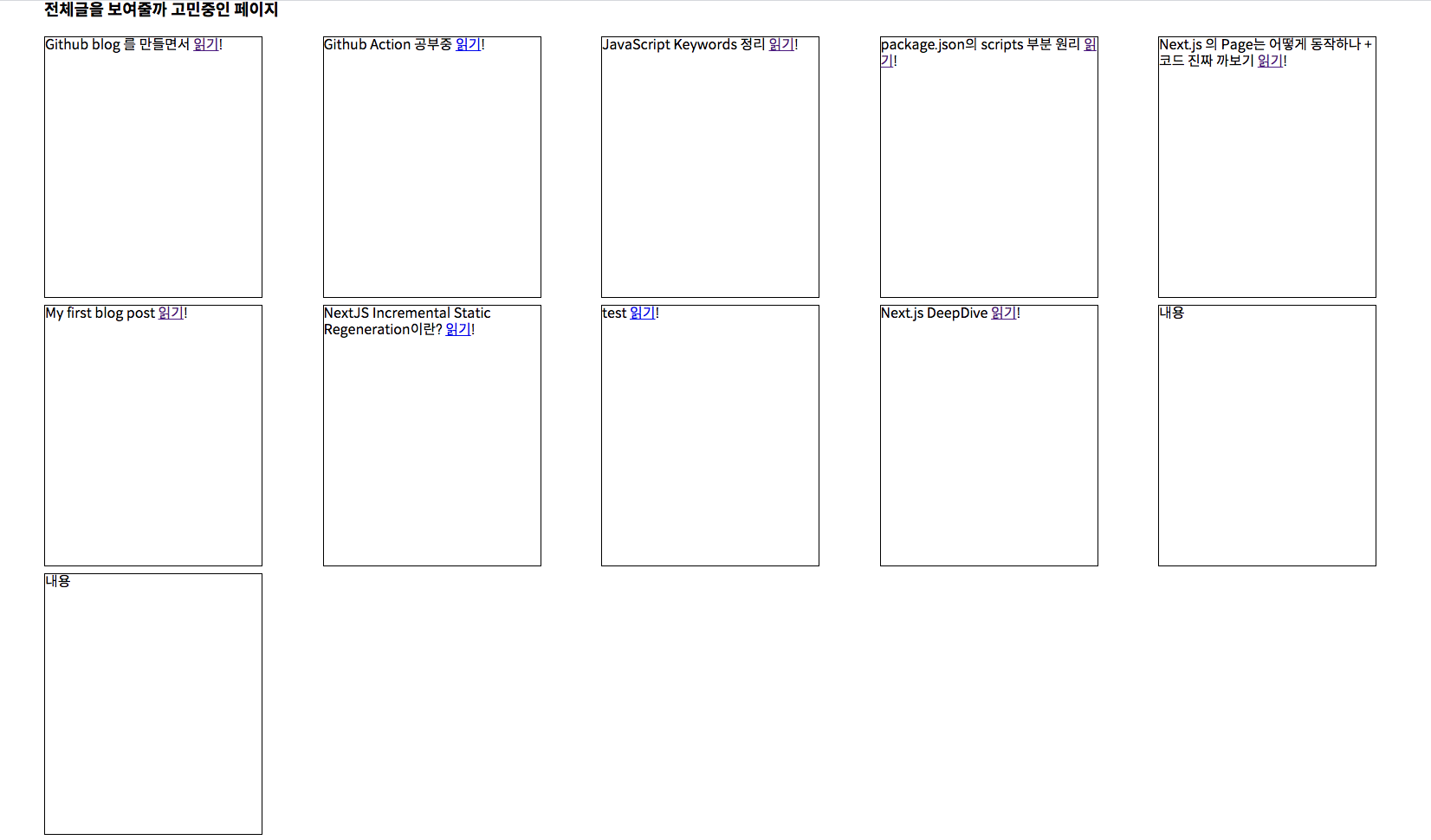 const CardLayoutWrapper = styled.div` display: grid; grid-template-columns: repeat(auto-fill, 250px); // 칼럼의 크기를 구하는 것, auto-fill을 통해서는 채울수 있는만큼 반복해서 column을 채운다 gap: 10px; // gap을 줄수있다 grid-auto-rows: 300px; // 행의 높이를 지정 justify-content: space-between; // flex에서 알아서 간격 배치되는것 `; // 카드의 크기 const Card = styled.div` width: 250px; height: 300px; border: 1px solid black; `; const CardLayout = ({ contents }) => { return ( <CardLayoutWrapper> {contents.map( ( d: { frontmatter: { title: React.ReactNode; slug: string } }, id: React.Key ) => { return ( <Card key={id}> {d.frontmatter.title} <Link to={d.frontmatter.slug}>읽기</Link>! </Card> ); } )} <Card>내용</Card> <Card>내용</Card> </CardLayoutWrapper> ); };고정된 카드의 크기를 알아서 넘치도록 보이게 하기 위해서 자료를 찾아봤다.