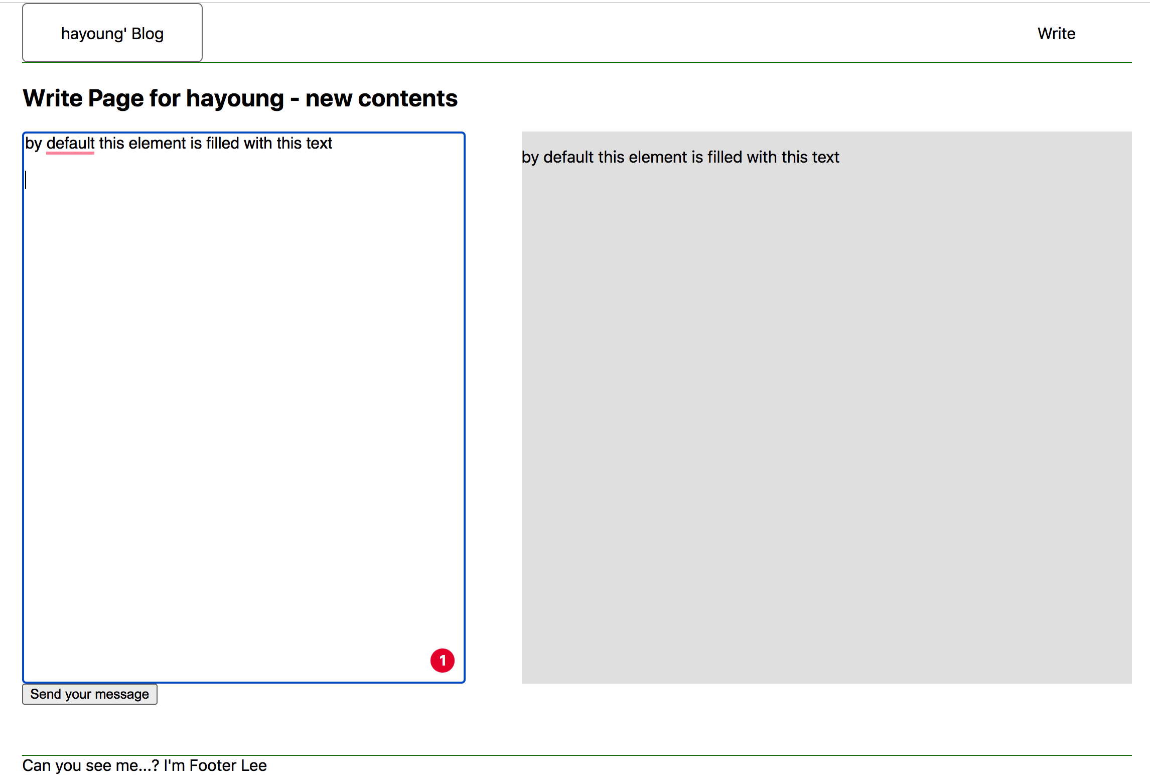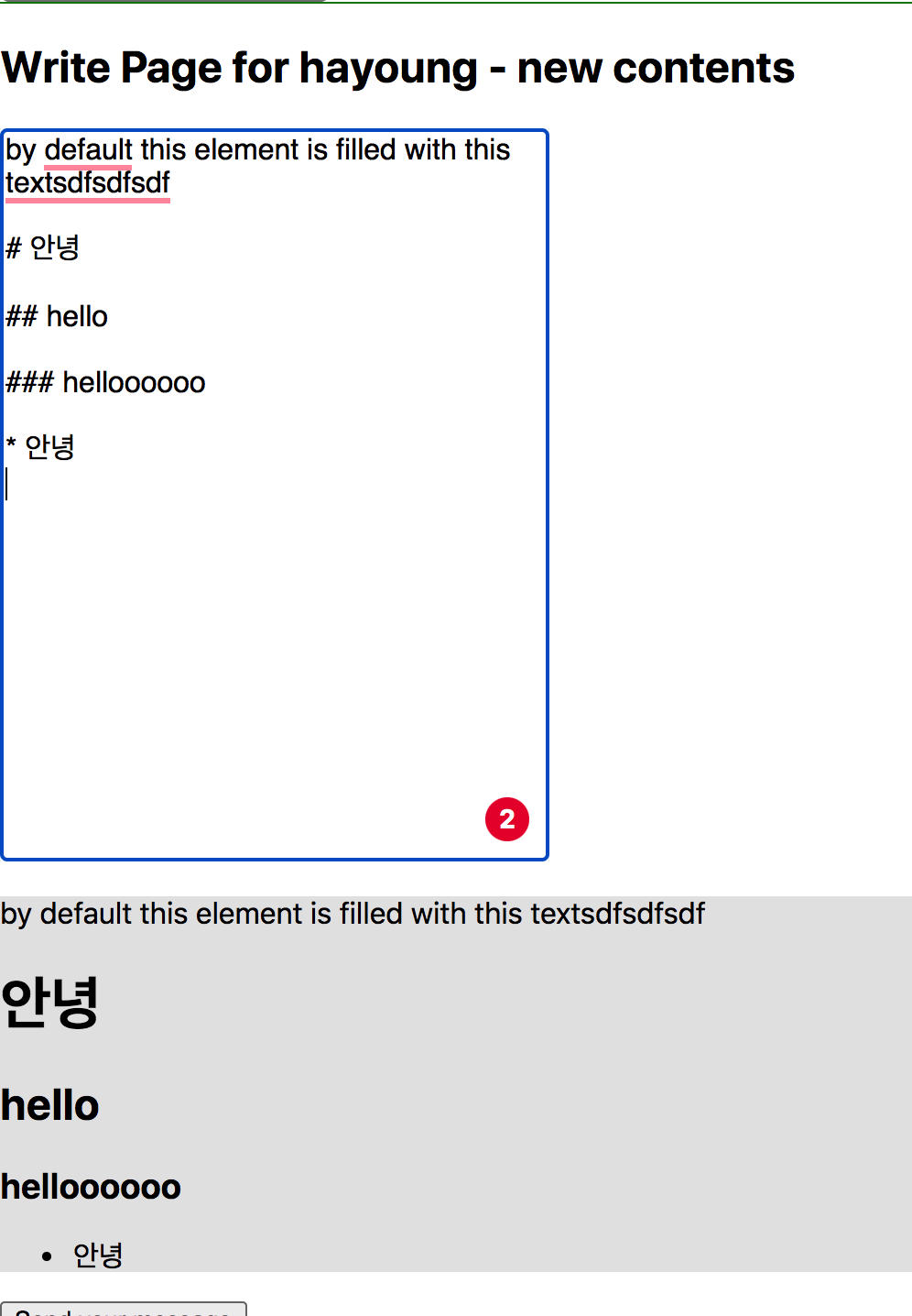 <form> <TextAreaStyle name="contents" value={contents} onInput={(e) => setContents(e.target.value)} ></TextAreaStyle> <MarkDownBody>{contents}</MarkDownBody> <div class="button"> <button type="submit">Send your message</button> </div> </form>이렇게 작성해서, 아래와같이 구현했다.