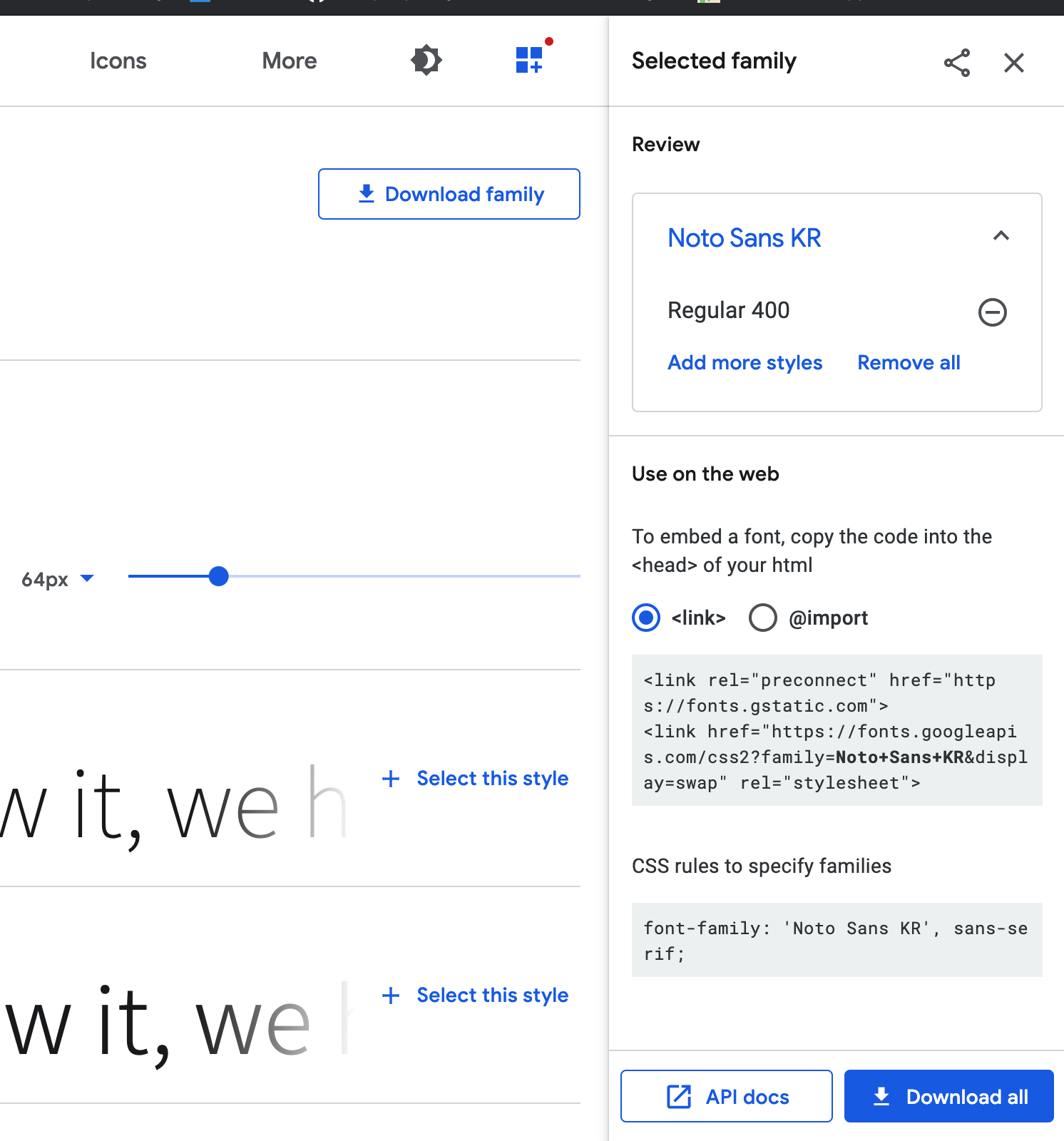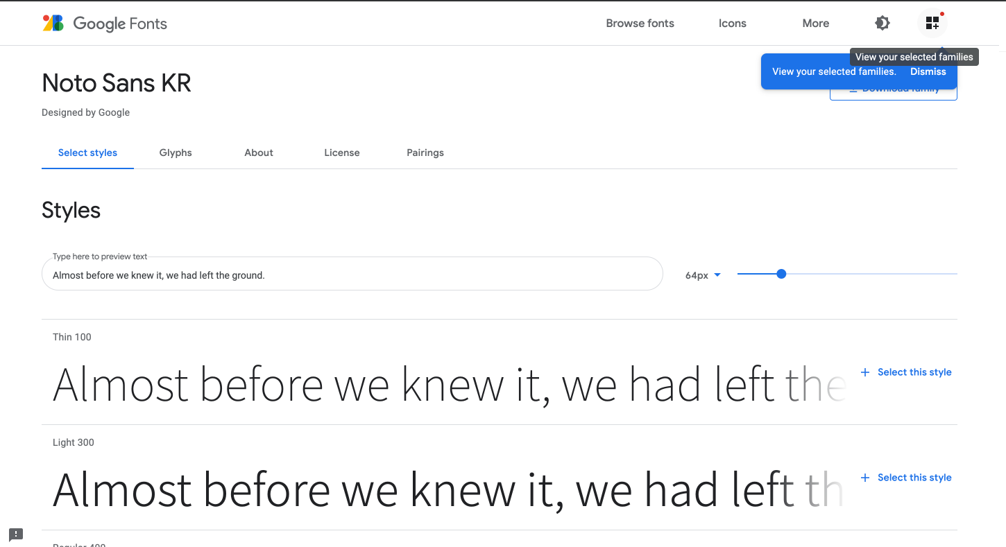 여기가 구글 웹폰트 페이지이다. 2. 버튼을 누르면 창이 열리는데 styles 중에 원하는것을 정하고 select this style을 누르면 우측에 아래와 같이 표시된다.