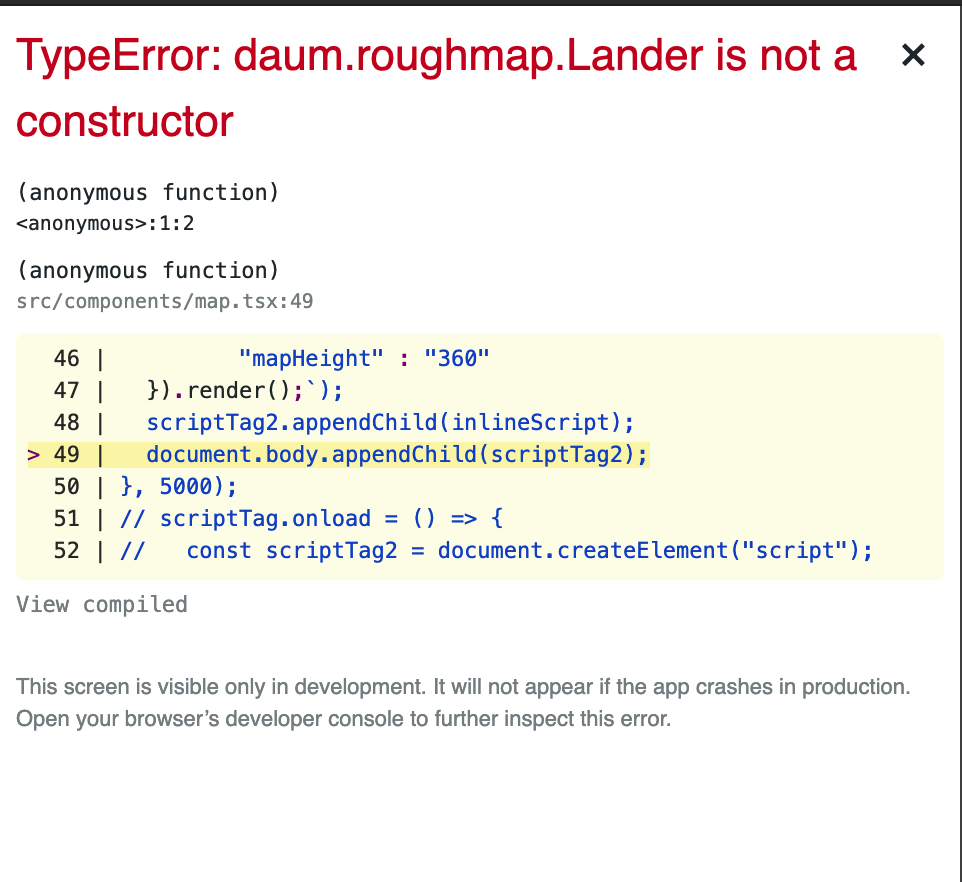 daum.roughmap 사용한것 - 브라우저 console에서 Gatsby에서는 아래 코드가 위의 2. 설치스크립트를 불러오지 못한다는 점이다.
