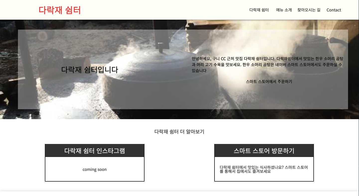 이번주에 이 프로젝트를 많이 진행했다. 이 전에도 여러번 시도했다가 몇 번을 엎었는데, 이번에는 완벽하진 않아도 프로젝트 초기 세팅 부터 markup, css 부터 도메인 설정까지 마무리 했다는 것이 뿌듯하다. 프로젝트를 하더라도 전반적인 과정을 모두 경험하는 과정은 흔치 않았는데 좋은 경험이 되었다. 특히 도메인을 설정할 일이 한번도 없었는데, 이번기회에 경험해서 내가 할 수 있는 일이라는 것을 알게 된 점도 뿌듯하다.