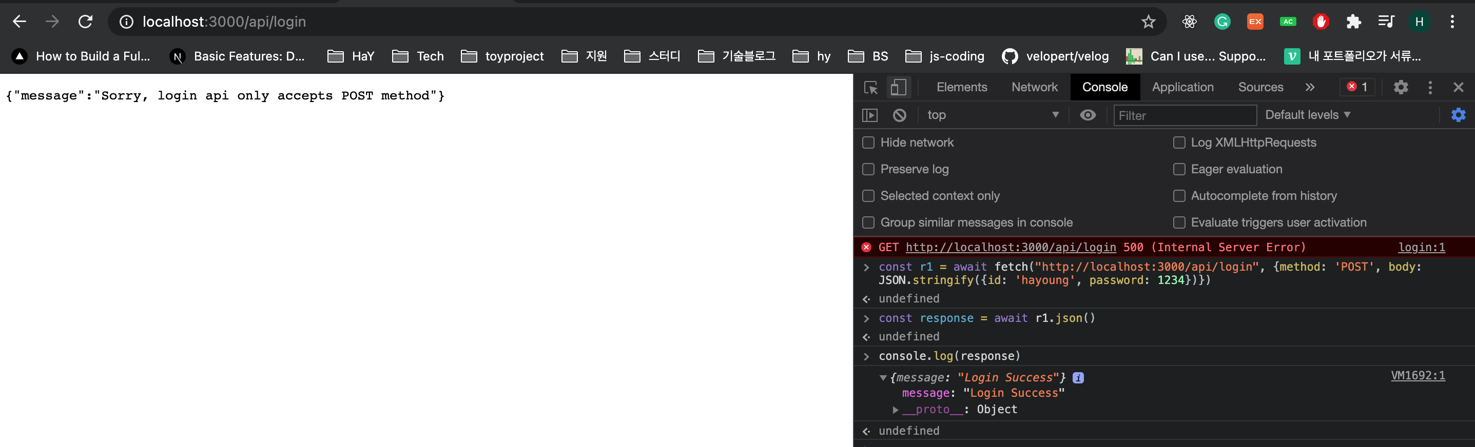 콘솔화면에서 이렇게 확인 가능하다! 좌측은 localhost:3000/api/login으로 get 요청시에 에러메시지를 보내는 것이고, 콘솔에서 post요청을 보내서 확인하면 된다는 것을 알 수 있다.