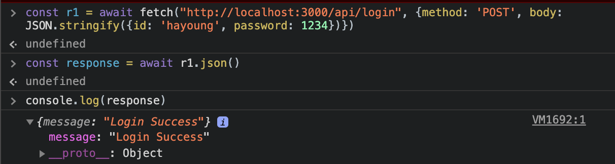 const r1 = await fetch("http://localhost:3000/api/login", {method: 'POST', body: JSON.stringify({id: 'hayoung', password: 1234}) }) const response = await r1.json() console.log(response)이 요청을 통해서 확인해 볼 수 있다(id는 JSON데이터에서 USER의 키와 대응하고, password는 해당 키에 대응하는 객체의 password에 대응한다.