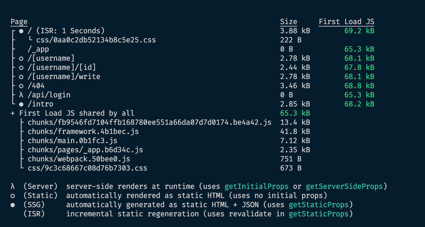 아래는 next build 후 next start했을때 보이는 화면이다. 상세하게 각페이지가 어떻게 빌드되어있는지를 보여주는데 가장위에 ISR이부분이 index.js가 Incremental Static Regeneration이 되었다고 보여주고 있다. 그리고 1초마다 regeneration이 되었다고 보여준다