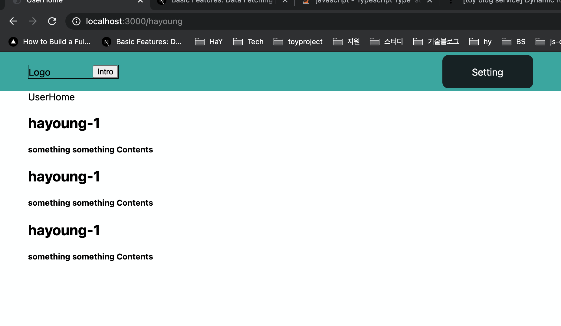 [toy blog service] Webpack, TypeScript와 React(Babel은 천천히!) (0) 2021.04.14 [toy blog service] Preview Mode 이해하기 (0) 2021.04.13 [toy blog service] Intro Page와 Index 페이지를 통해서 살펴보는 Static Generation과 Incremental Static Regeneration차이 (0) 2021.04.13 [toy blog service] 각페이지를 어떻게 렌더링할지... + json으로 가짜 서버 만들기 (0) 2021.04.13 [toy blog service] Next.js의 Pages 이해하기(간단한 Typescript설정) (0) 2021.04.11