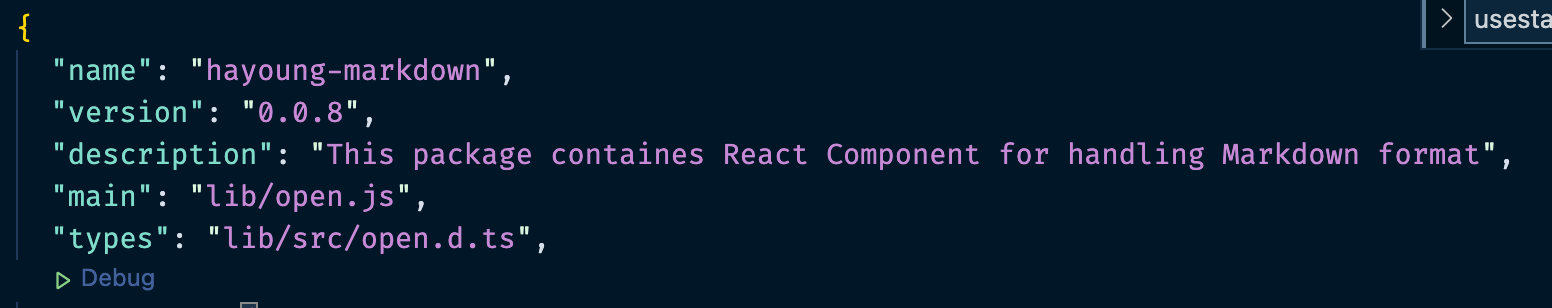 배포할때 lib 폴더를 포함시키고, 아래처럼 이 라이브러리를 사용할때 lib폴더에 있는 open.js 파일을 읽도록 구성했다. 그리고 types 은 lib/src/open.d.ts 에 있도록 구성했다.