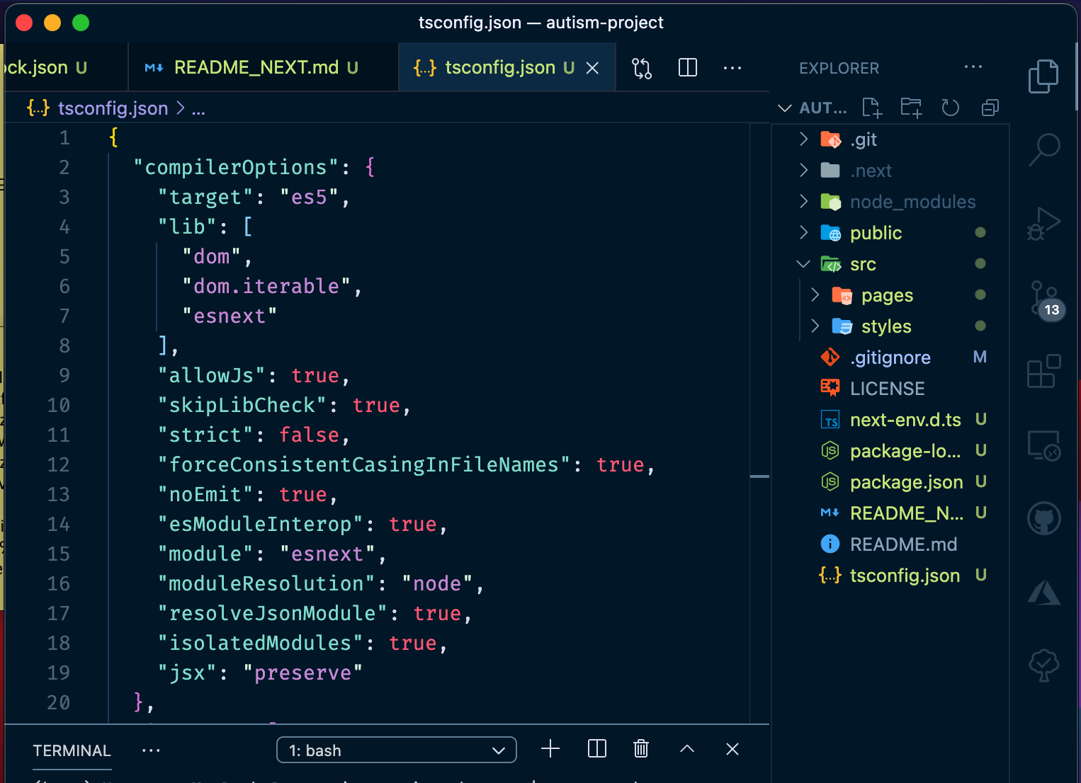 tsconfig.json이 채워진 모습 여기까지만하면 Next.js 프로젝트내에서 TypeScript를 문제없이(더 세부적인 설정을 할 수도 있겠지만) 사용할 수 있었다.