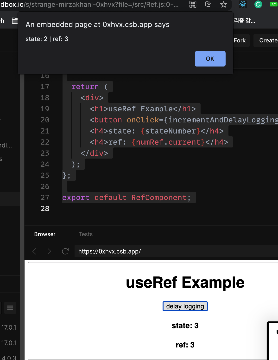 import { useState, useRef } from "react"; const RefComponent = () => { const [stateNumber, setStateNumber] = useState(0); const numRef = useRef(0); function incrementAndDelayLogging() { setStateNumber(stateNumber + 1); numRef.current++; setTimeout( // stateNumber은 이전값을 가지고있다. closure () => alert(`state: ${stateNumber} | ref: ${numRef.current}`), 1000 ); } return ( <div> <h1>useRef Example</h1> <button onClick={incrementAndDelayLogging}>delay logging</button> <h4>state: {stateNumber}</h4> <h4>ref: {numRef.current}</h4> </div> ); }; export default RefComponent; // from https://codesandbox.io/s/strange-mirzakhani-0xhvx?file=/src/Ref.js:0-648위의 코드를 보면 useEffect내에서 state를 업데이트 하더라도, setTimeout에서 콜백함수가 실행될때는 변화한 state가 아니라, 이 콜백함수가 등록될때의 state가 보여진다.