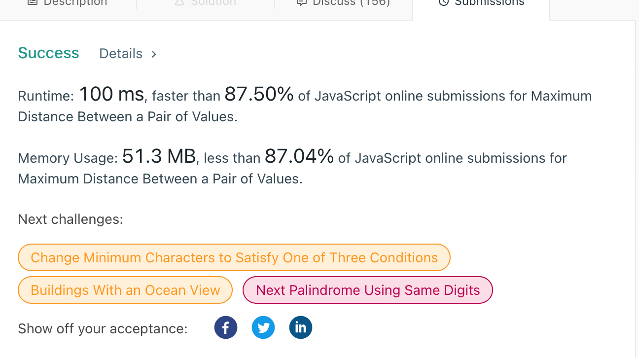 /** * @param {number[]} nums1 * @param {number[]} nums2 * @return {number} */ var maxDistance = function(nums1, nums2) { let answer = 0; let count = 0; for(let i = 0; i < nums1.length; i++){ let temp = 0; for(let j = i + answer; j < nums2.length; j++){ if(nums1[i] <= nums2[j]){ temp = j - i; }else{ break; } } if(answer < temp){ answer = temp; count = 1; }else if(answer === temp){ count++; } } return answer; };non-increasing인데다가 배열길이가 각각 10의 5승이라 이중 포문돌면 난리가 날거라는 생각은 했다.