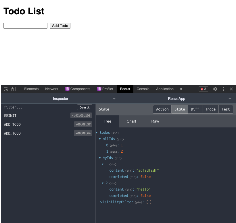 파일구조, redux폴더 내에 reducer와 store를 정의한다 // store.js 파일 import { createStore } from "redux"; import rootReducer from "./reducers"; export default createStore(rootReducer); // reducers/index.js // reducer를 comine해준다 import { combineReducers } from "redux"; import visibilityFilter from "./visibilityFilter"; import todos from "./todos"; export default combineReducers({ todos, visibilityFilter });3. redux devtools 설정