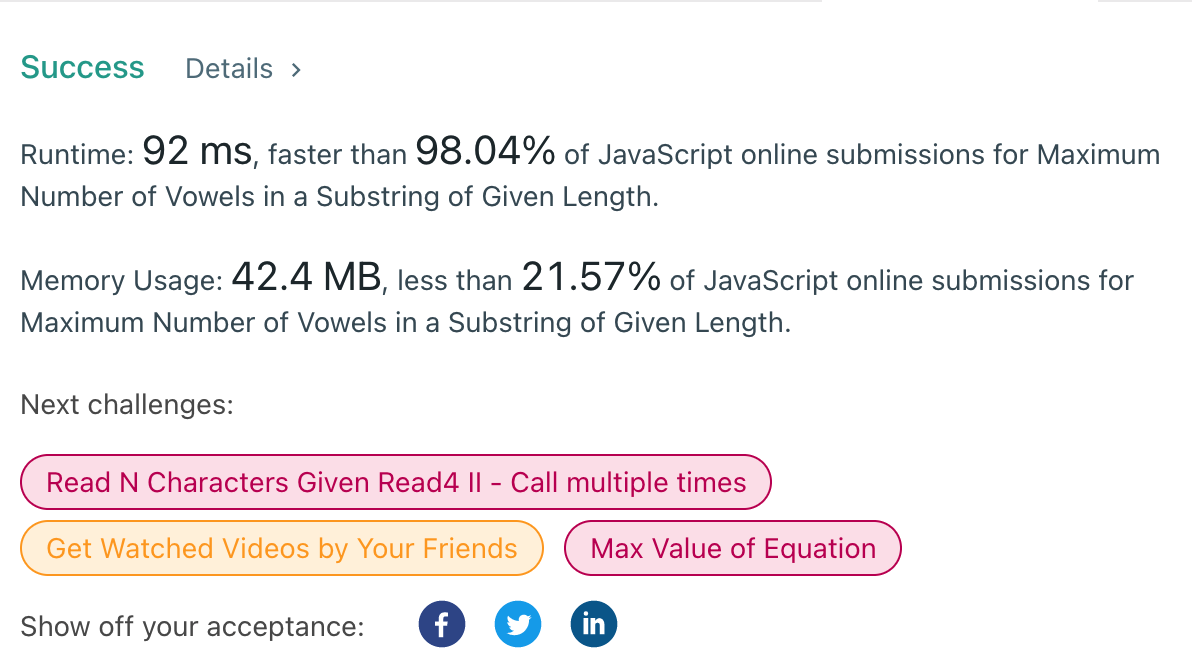 /** * @param {number[]} customers * @param {number[]} grumpy * @param {number} minutes * @return {number} */ var maxSatisfied = function(customers, grumpy, minutes) { let left = 0; let right = minutes; let sum = 0; // 해당 구간에 불만족한 사람, 현제는 left 부터 right앞까지 let maxSum = 0; let total = 0; // 전체 구간에서 지금 만족하는 사람, sum구간이 만약에 다 0으로 바뀌면 sum만큼 증가 가능 for(let i = 0; i < customers.length; i++){ if(i < right && grumpy[i] === 1){ sum += customers[i]; // 이 구간에 있는 불만족할 사람 } if(grumpy[i] === 0){ total += customers[i]; // 총 만족하는 사람 } } // sum을 최대화해야한다. maxSum = sum; for(let i = 1; i < customers.length - (minutes - 1); i++){ let newSum = sum; if(grumpy[left] === 1){ newSum -= customers[left]; } if(grumpy[right] === 1){ newSum += customers[right]; } if(maxSum < sum){ maxSum = sum; } sum = newSum; left++; right++; } if(maxSum < sum){ maxSum = sum; } return total + maxSum; };2. Maximum Number of Vowels in a Substring of Given Length: 12m25s94