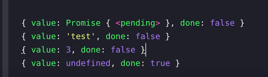 function* test(array) { for(let i = 0; i < array.length; i++){ yield array[i] } } const getArray = test([1,2,3,4,5]) getArray.next(); getArray.next(); getArray.next(); getArray.next(); getArray.next(); getArray.next();