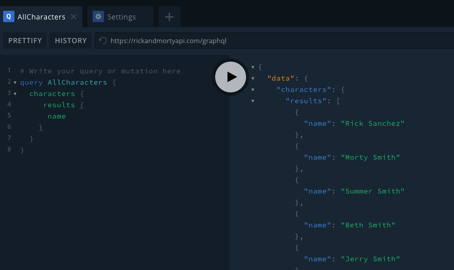 - Rick and Morty Playground: https://rickandmortyapi.com/graphql